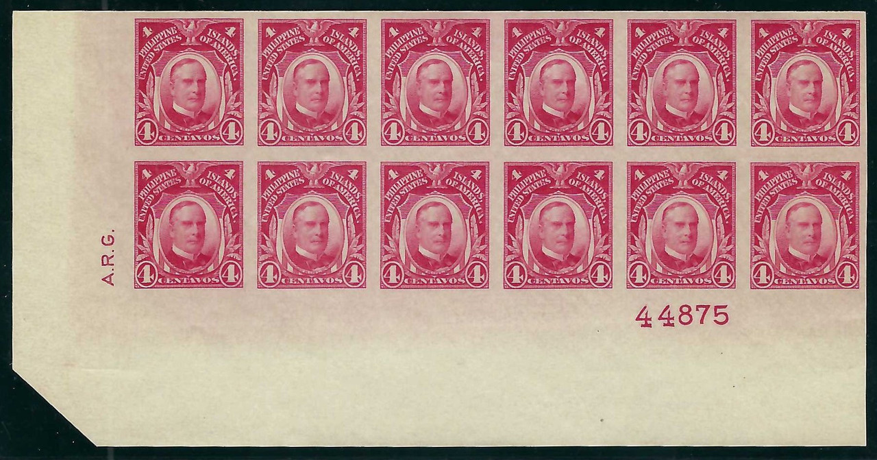 Philippine 1931 4c carmine rose William McKinley Imperforate (#341), Bottom Plate #44875 and Siderographers Initials A.R.G. (Alfred R. Gould) block of 12, Unused, Very Lightly Hinged, Fresh and Very Fine to Extremely Fine. Scarce and Attractive Multiple!