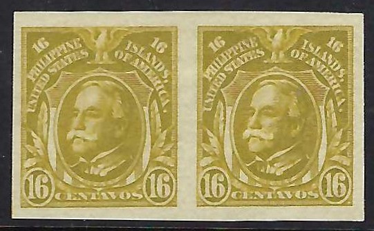 Philippine 1925 16c bister green Dewey Imperforate (#346a) horizontal pair, Unused, Lightly Hinged, Fresh and Very Fine to Extremely Fine. Scarce and Desirable 1925 issue, only 2200 issued!