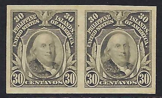 Philippine 1925 30c gray Franklin Imperforate (#349a) horizontal pair, Unused, Original Gum, Fresh and Very Fine to Extremely Fine. Scarce and Desirable 1925 issue, only 2200 issued!